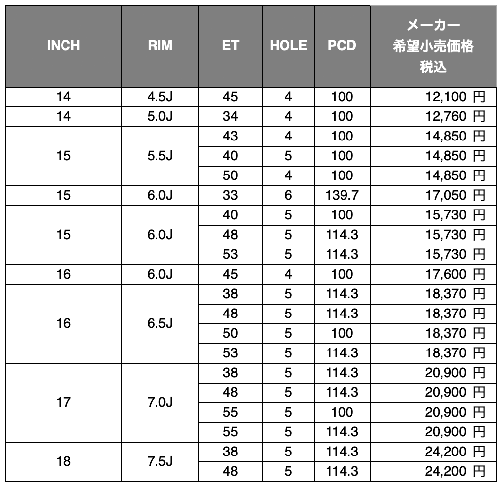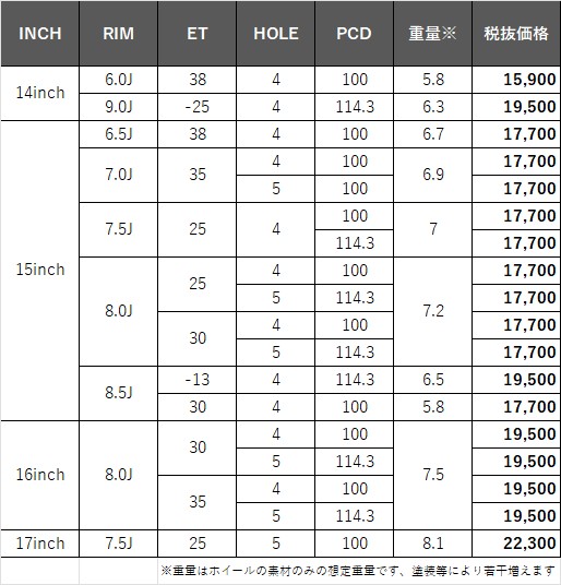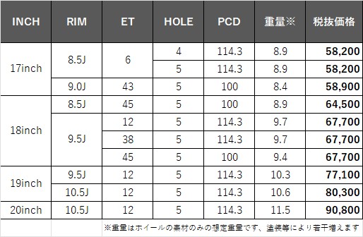 製作するサイズは、このホイールを使いたいユーザーさんからのリクエストで決定しております。そのため、一般的に市販されてないような、インセット、H数、PCDが多いのが特徴です。